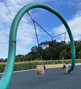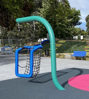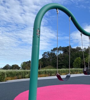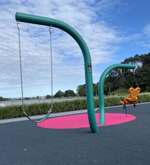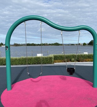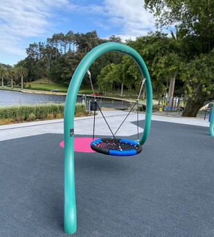 Powdercoated in the colour of Pounamu, the swings add an eye-catching element to the playground’s overall design. The frame reflects the ripples that can be seen on Lake Rotoroa while young (and old) can enjoy the magic of swinging high.