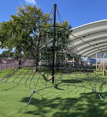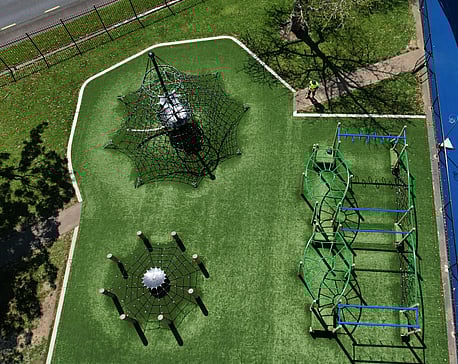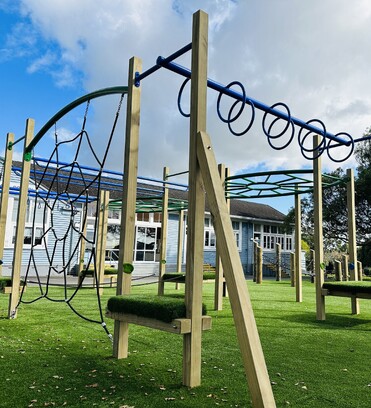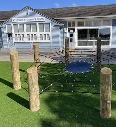 Other features of the Howick Intermediate School playground include circuit playground equipment with long C Challenges, Olympic and Gladiator Rings, Double Balance Rope, and two Spider Nets. Providing a safe surface underneath the entire play area is artificial turf, supplied and installed by project partners