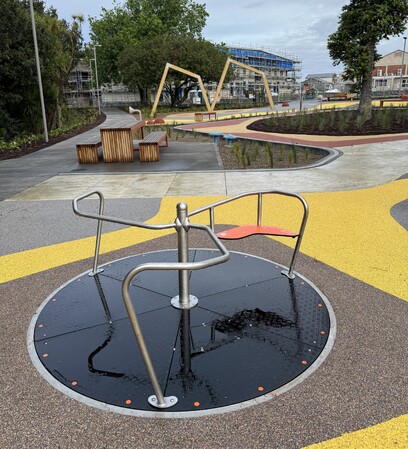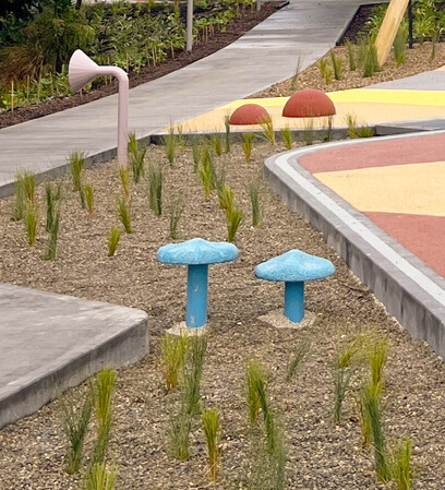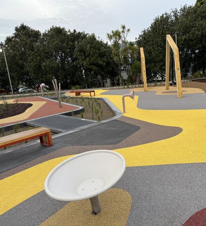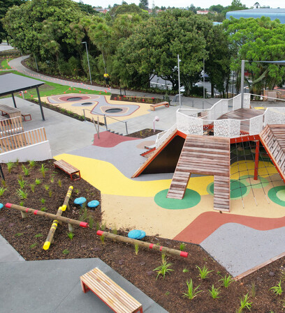 Guided by the mana whenua narrative, The Mists of Kohuora, the design of the play space draws inspiration from Auckland’s volcanic heritage. A strong volcanic theme to it with undulating mounds and volcanic-inspired cushion-fall areas, encouraging plenty of active play. The resulting play landscape is rich in texture and movement, shaped by undulating landforms, sculptural mounds, and cushion-fall surfacing reminiscent of volcanic flows.