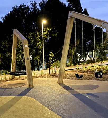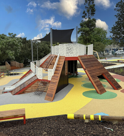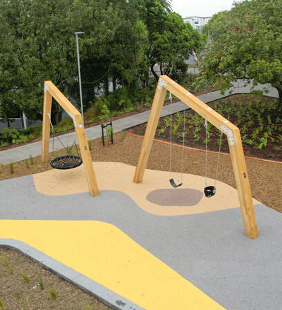 Beyond the playground, a basketball half-court, landscaped gathering areas, walkways, and cycleways have been incorporated into the broader design to create an active yet relaxed recreational hub.
