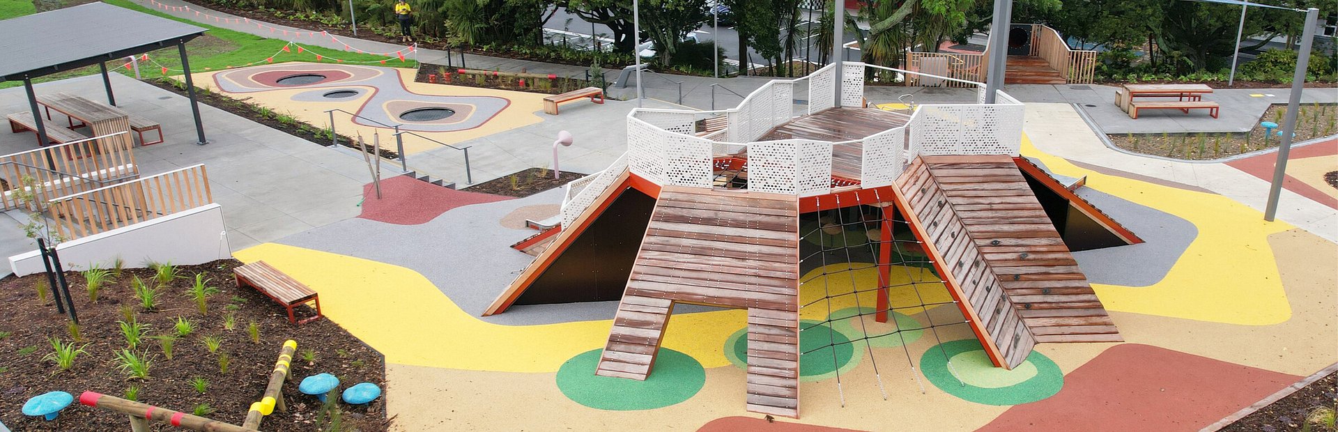 Guided by the mana whenua narrative, The Mists of Kohuora, the design of the play space draws inspiration from Auckland’s volcanic heritage. A strong volcanic theme to it with undulating mounds and volcanic-inspired cushion-fall areas, encouraging plenty of active play. The resulting play landscape is rich in texture and movement, shaped by undulating landforms, sculptural mounds, and cushion-fall surfacing reminiscent of volcanic flows.