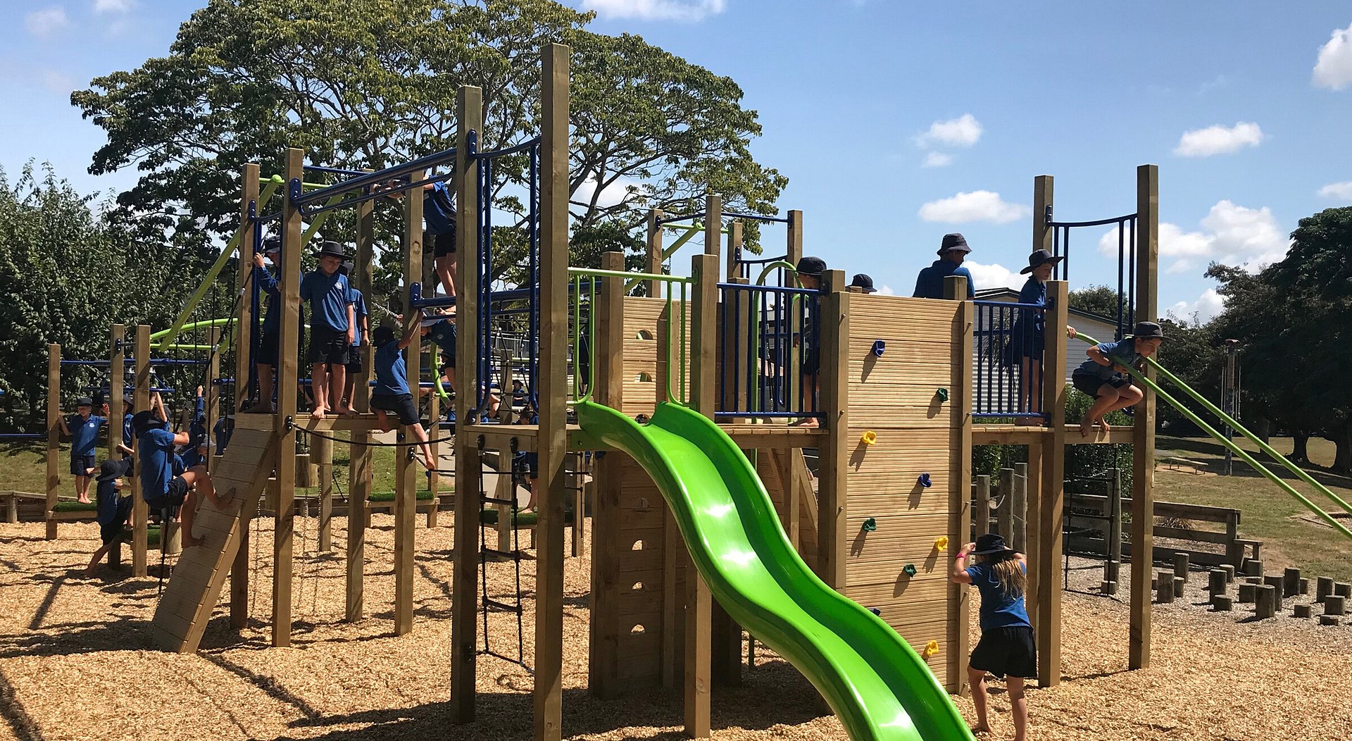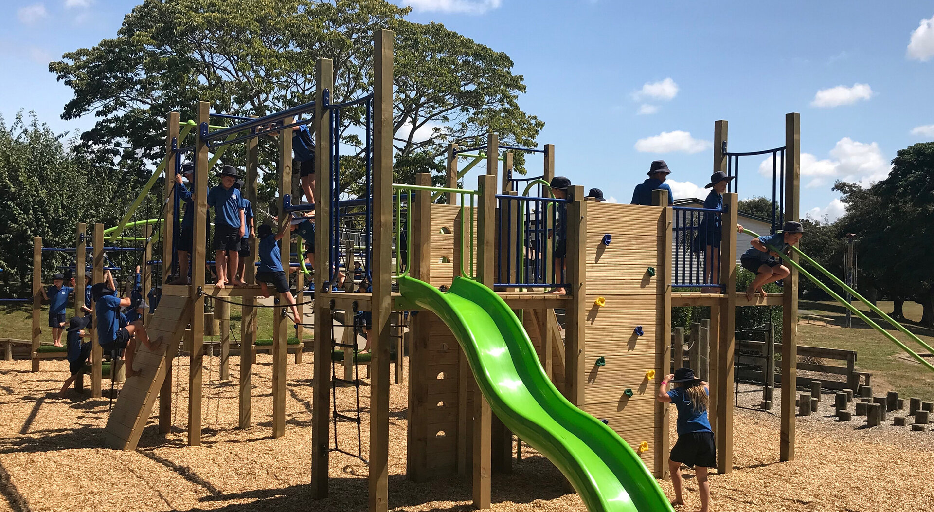 Hence Puahue School’s brief for their new playground was based on the concept of sustainability – a way of being and acting that nurtures people and nature, now and in the future. The play area needed to be packed with play value – balance, climbing, strengthening, slides and overhead activities – while being robust and having little ongoing maintenance.
