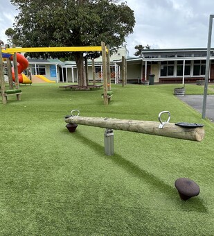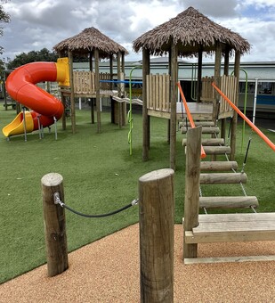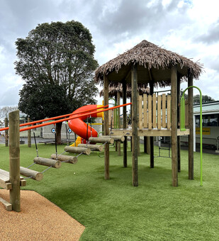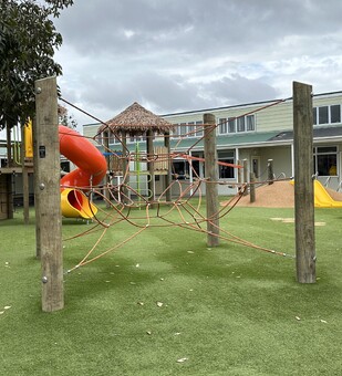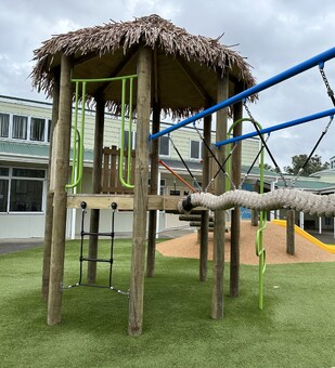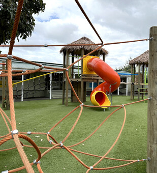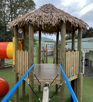 Two fale play towers, connected by a natural plated jungle rope, took centre stage. Equipment off the towers consisted of a bright twisted tube slide, mountain climber, bridges, ladders, stepping logs, climbing walls, and overhead activities all of which provide children with opportunities to learn and grow.