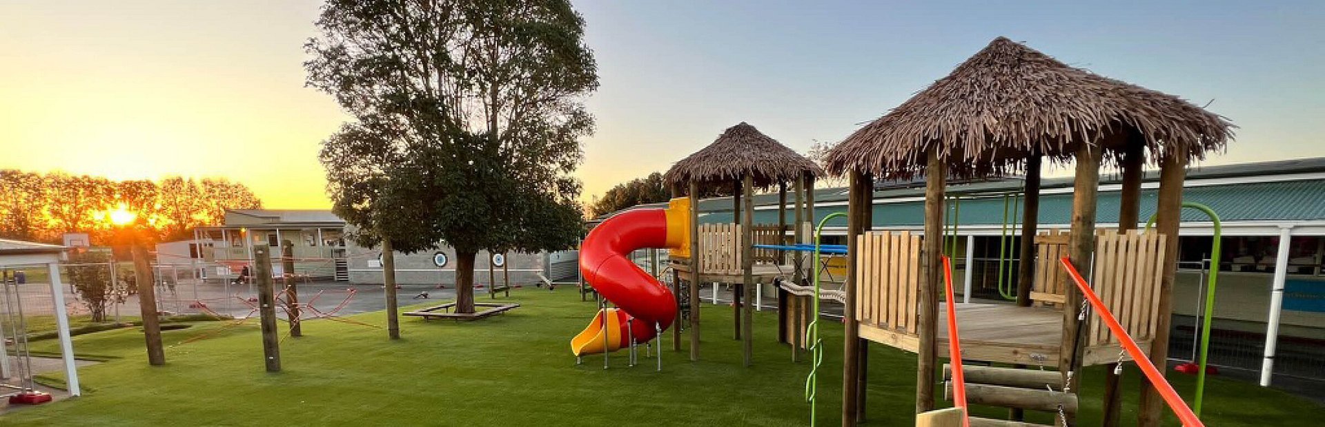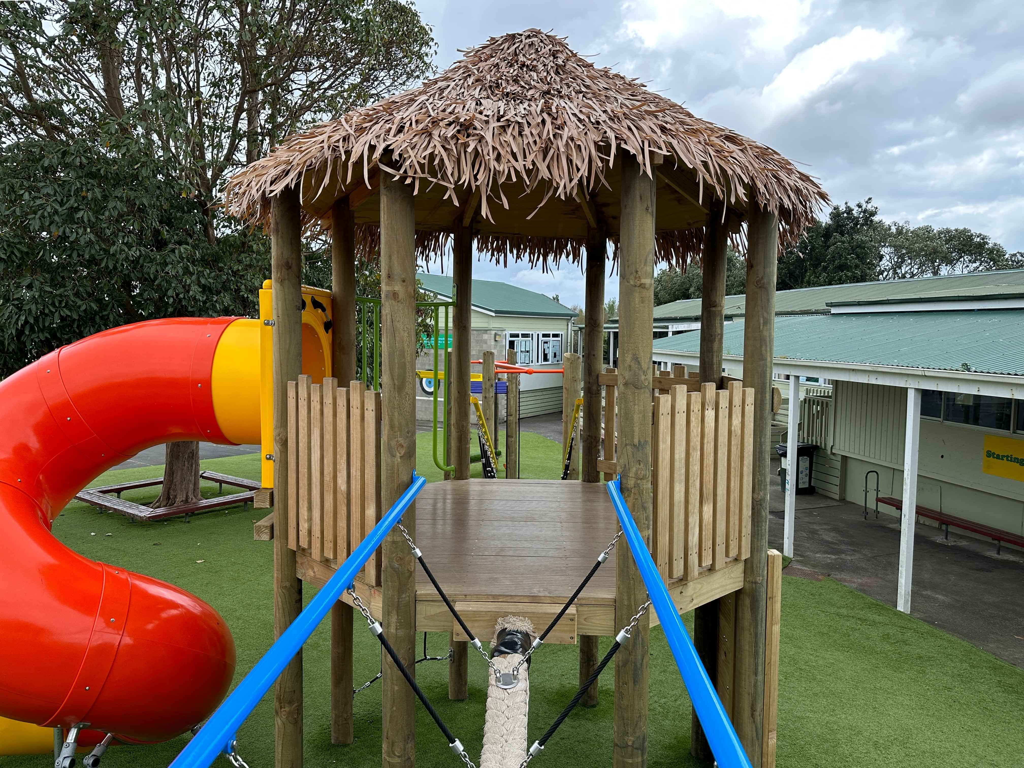 Two fale play towers, connected by a natural plated jungle rope, took centre stage. Equipment off the towers consisted of a bright twisted tube slide, mountain climber, bridges, ladders, stepping logs, climbing walls, and overhead activities all of which provide children with opportunities to learn and grow.