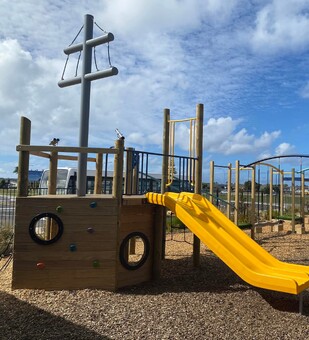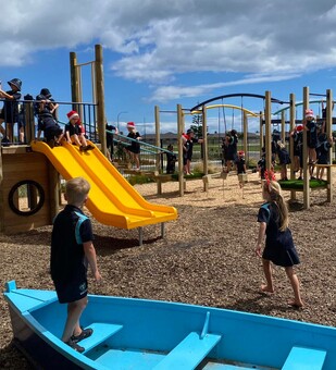 The first of the two playgrounds to be built was the junior playground in 2021. This space incorporated the ship that Suzanne Aubert travelled on from France and portrayed her connection with the Whanganui River. A vibrant blue dingy encourages collaborative and imaginative play, while strategically placed river rocks nearby challenge children’s balance.