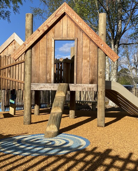 Stories of the tangata whenua underpin each play area. Tūmoana, an old fishing ground is represented in the hīnaki (fishing trap) inspired play equipment, while the water play area signifies the Hīrangi stream which once ran through the land. This ensures the papa tākaro is not only a playground but a learning environment for tamariki and whānau as well.